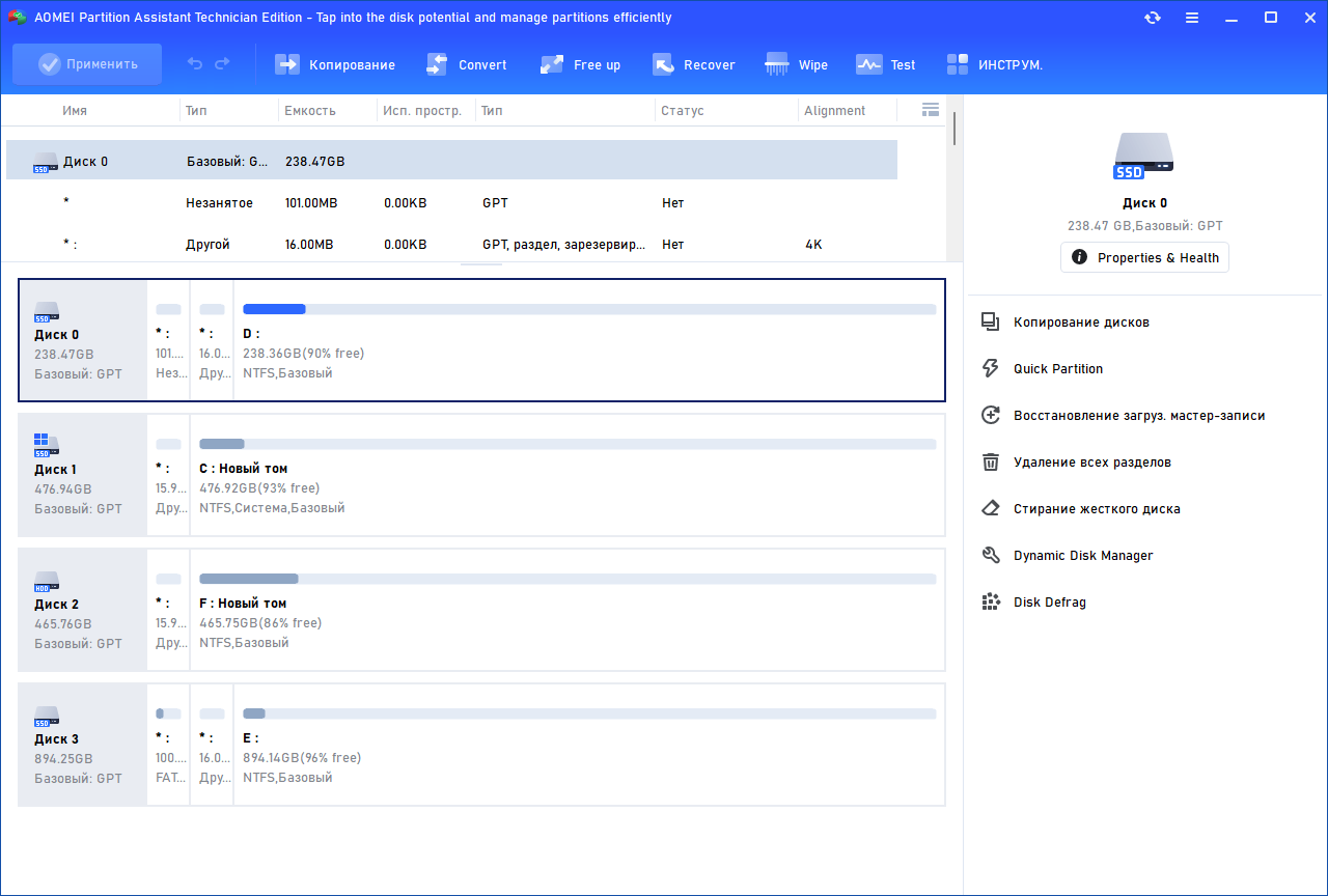 - Поддержка работы с динамическими дисками и управление ими через встроенный AOMEI Dynamic Disk Manager Pro;