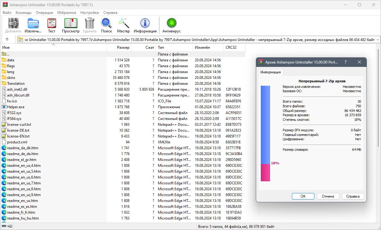 Ниже представлена таблица с основными техническими характеристиками Ashampoo UnInstaller 15.00.00 Portable by 7997: