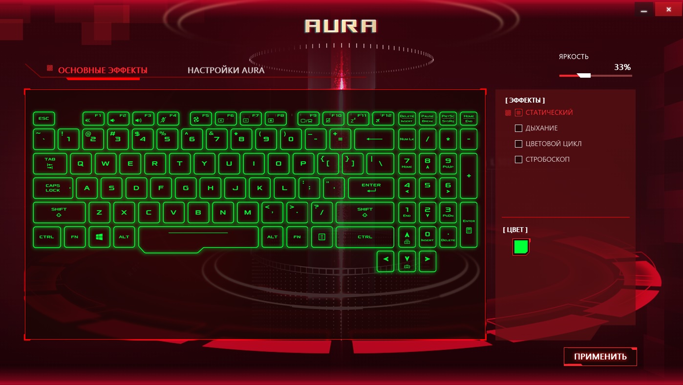 - Настройка цветовой палитры и эффектов подсветки клавиатуры