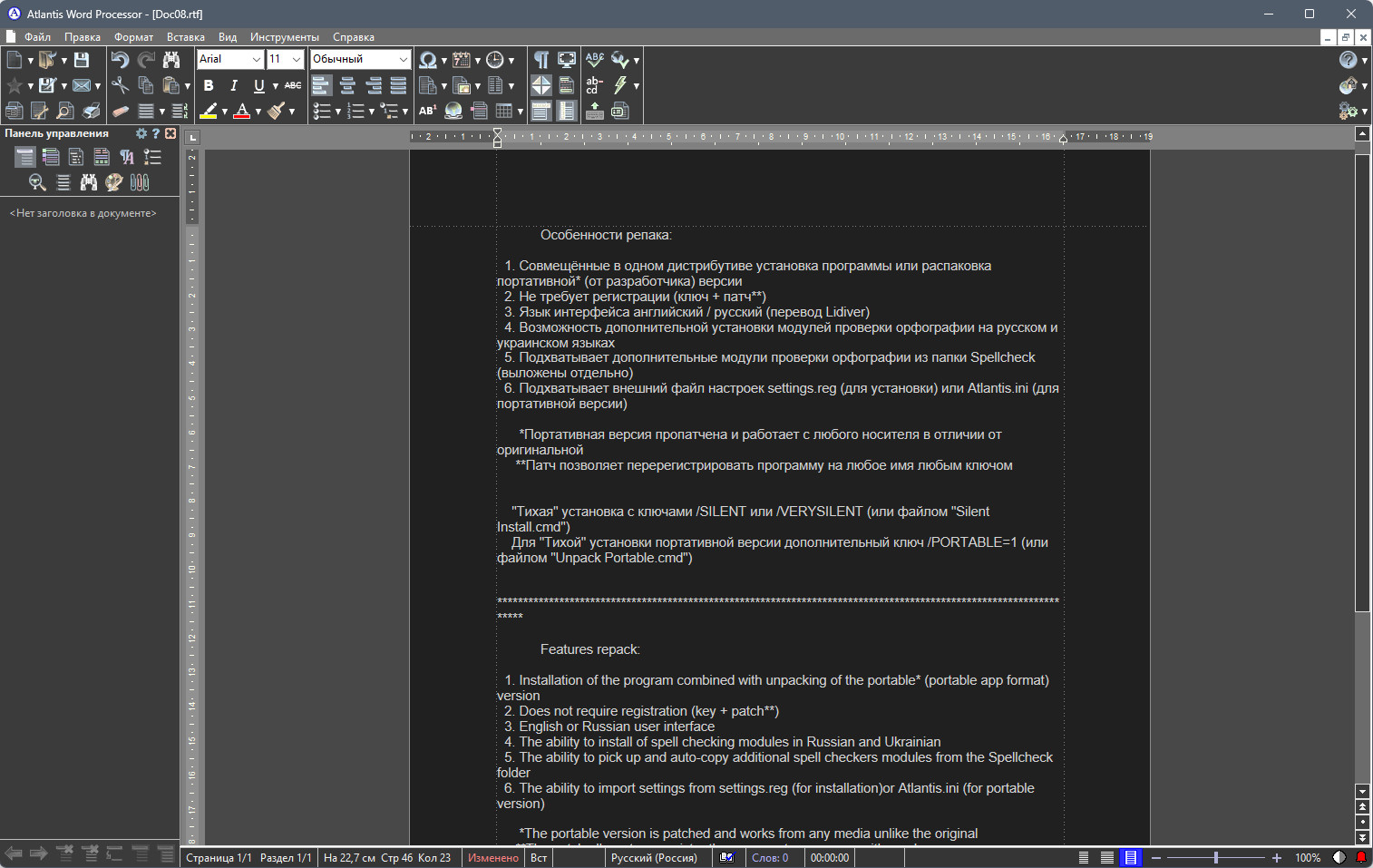 Atlantis Word Processor — это мощный и удобный текстовый редактор, предназначенный для профессиональной работы с документами. Он предлагает широкий набор инструментов, которые позволяют создавать, редактировать и форматировать текстовые файлы с высоким уровнем комфорта и безопасности.