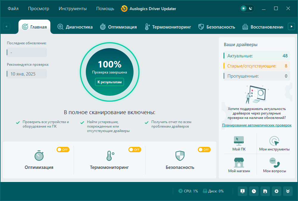 Auslogics Driver Updater — это удобный инструмент, который автоматизирует процесс поиска и установки последних версий драйверов. Благодаря простому интерфейсу и множеству автоматических функций, программа подходит как для новичков, так и для опытных пользователей.