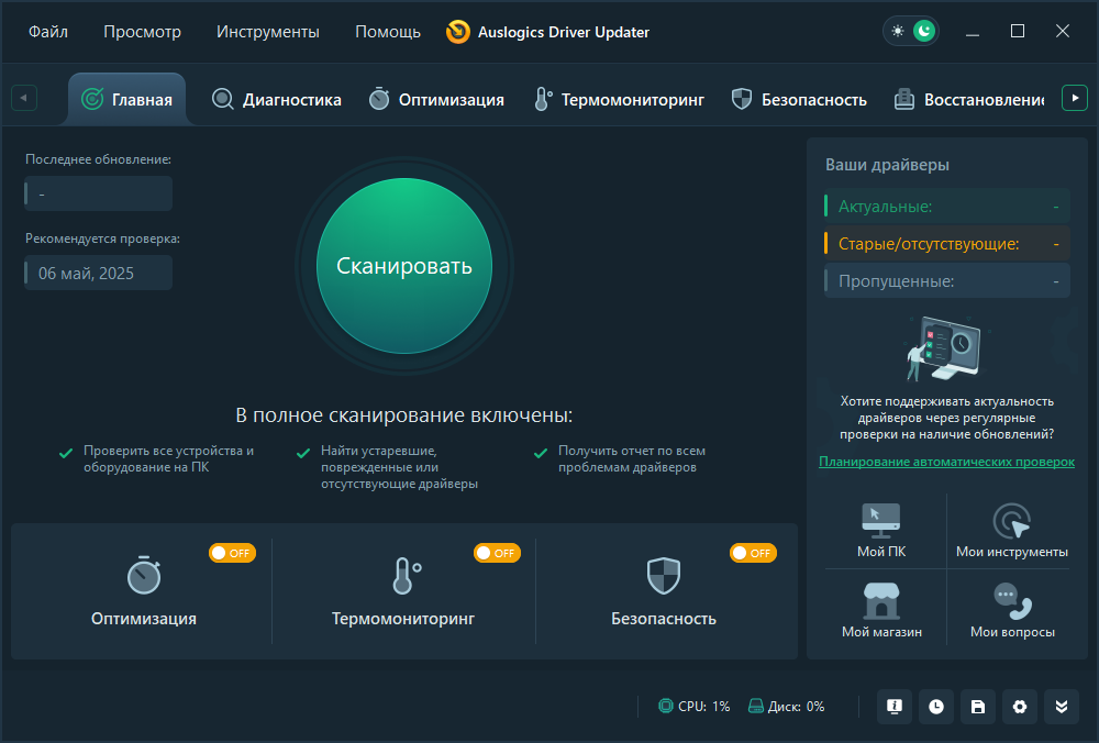 - Автоматический сканинг системы на наличие устаревших драйверов