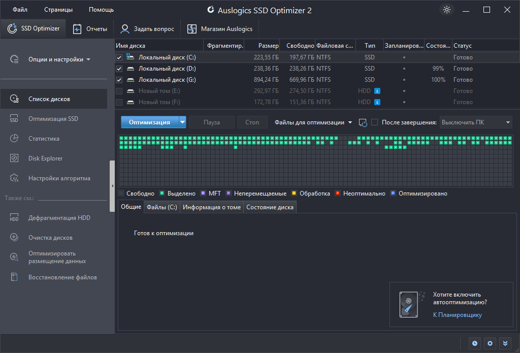 Auslogics SSD Optimizer предлагает широкий спектр функций для эффективного обслуживания SSD-дисков. Благодаря удобному интерфейсу и автоматизации процессов, программа значительно облегчает оптимизацию и контроль состояния накопителей.