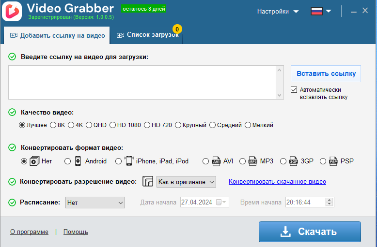Auslogics Video Grabber — это мощный и удобный инструмент для скачивания и конвертирования видео с популярных интернет-платформ. Он предназначен для пользователей, желающих сохранять видеоконтент на своих устройствах и управлять им в удобном формате.
