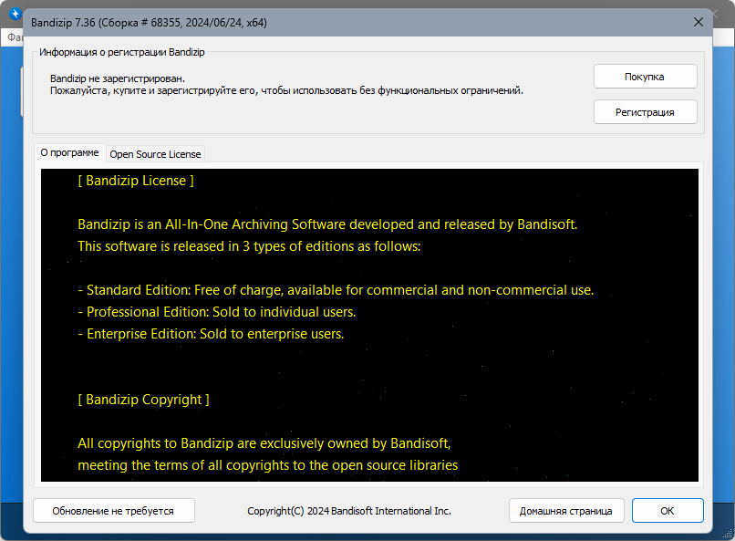 Ниже приведены основные технические параметры текущей версии Bandizip: