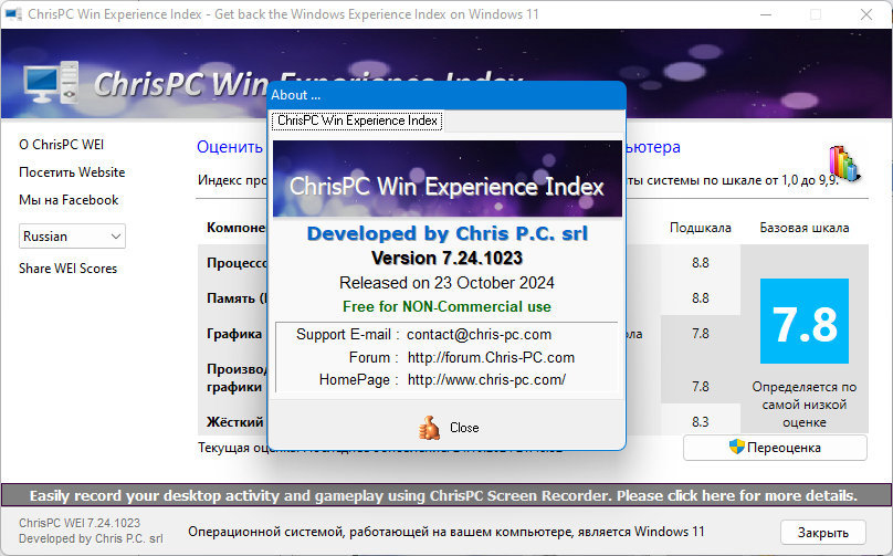ChrisPC Win Experience Index — это бесплатная утилита, предназначенная для оценки производительности компьютера под управлением различных версий Windows. Программа позволяет быстро и легко определить индекс работы основных компонентов системы, что помогает оценить её общую работоспособность и выявить возможные узкие места.