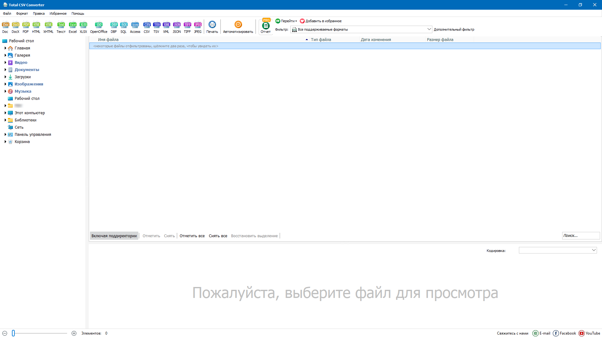 - Конвертация CSV и TSV файлов в DOC, PDF, HTML, TXT, XLS, XLSX, XML, JSON, DBF и форматы OpenOffice
