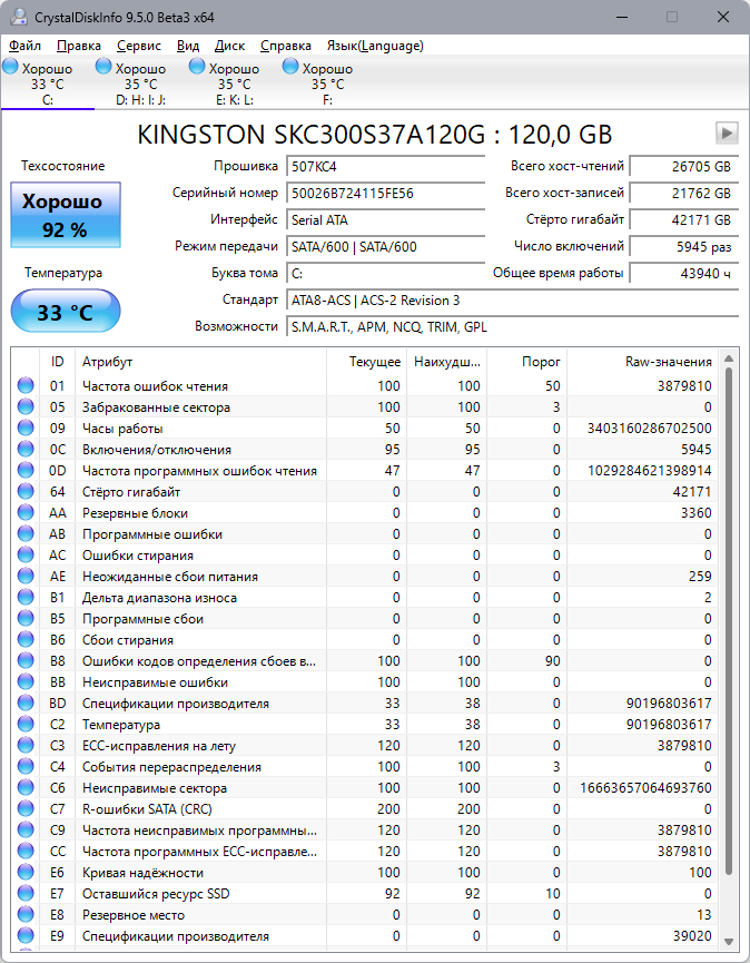 - Отображение детальных данных о дисках, включая прошивку, серийный номер и интерфейс