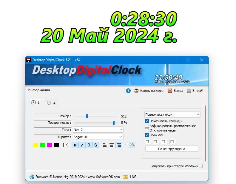 Для использования программы достаточно скачать её и запустить, не требуя дополнительных активаторов или ключей. Портативная версия позволяет запускать часы прямо из любой папки без установки, что удобно для переносных устройств или временного использования.