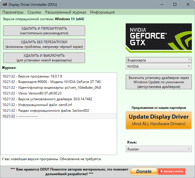- Полное удаление драйверов видеокарт AMD, NVIDIA и Intel без остаточных файлов и ключей реестра.