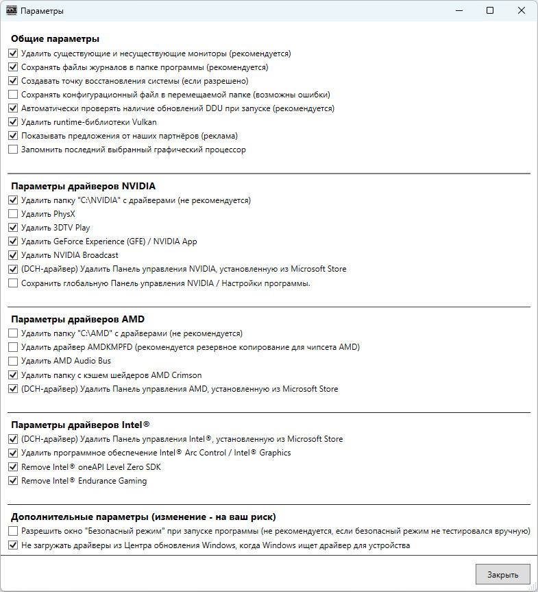 - Полное удаление драйверов видеокарт AMD, NVIDIA и Intel, а также драйверов звуковых карт Realtek и Sound Blaster.