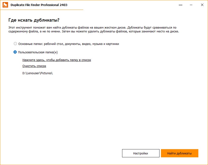 - Глубокий анализ выбранных папок на наличие дубликатов файлов