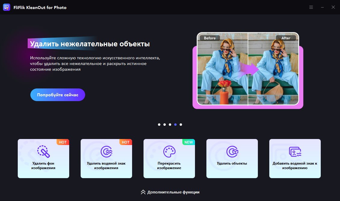 FliFlik KleanOut for Photo — это мощный инструмент для редактирования фотографий, разработанный для удаления водяных знаков, нежелательных объектов и фона. Благодаря использованию передовых алгоритмов искусственного интеллекта он делает процесс профессиональной обработки доступным даже для новичков.