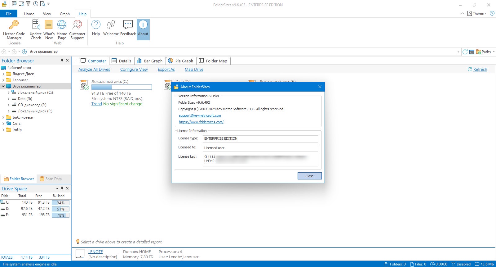 FolderSizes 9.6.492 Enterprise — это мощная программа для анализа и управления дисковым пространством на компьютерах с операционными системами Windows. Она позволяет пользователям быстро получать подробную информацию о размере папок и файлов, помогая оптимизировать использование диска и освобождать место.