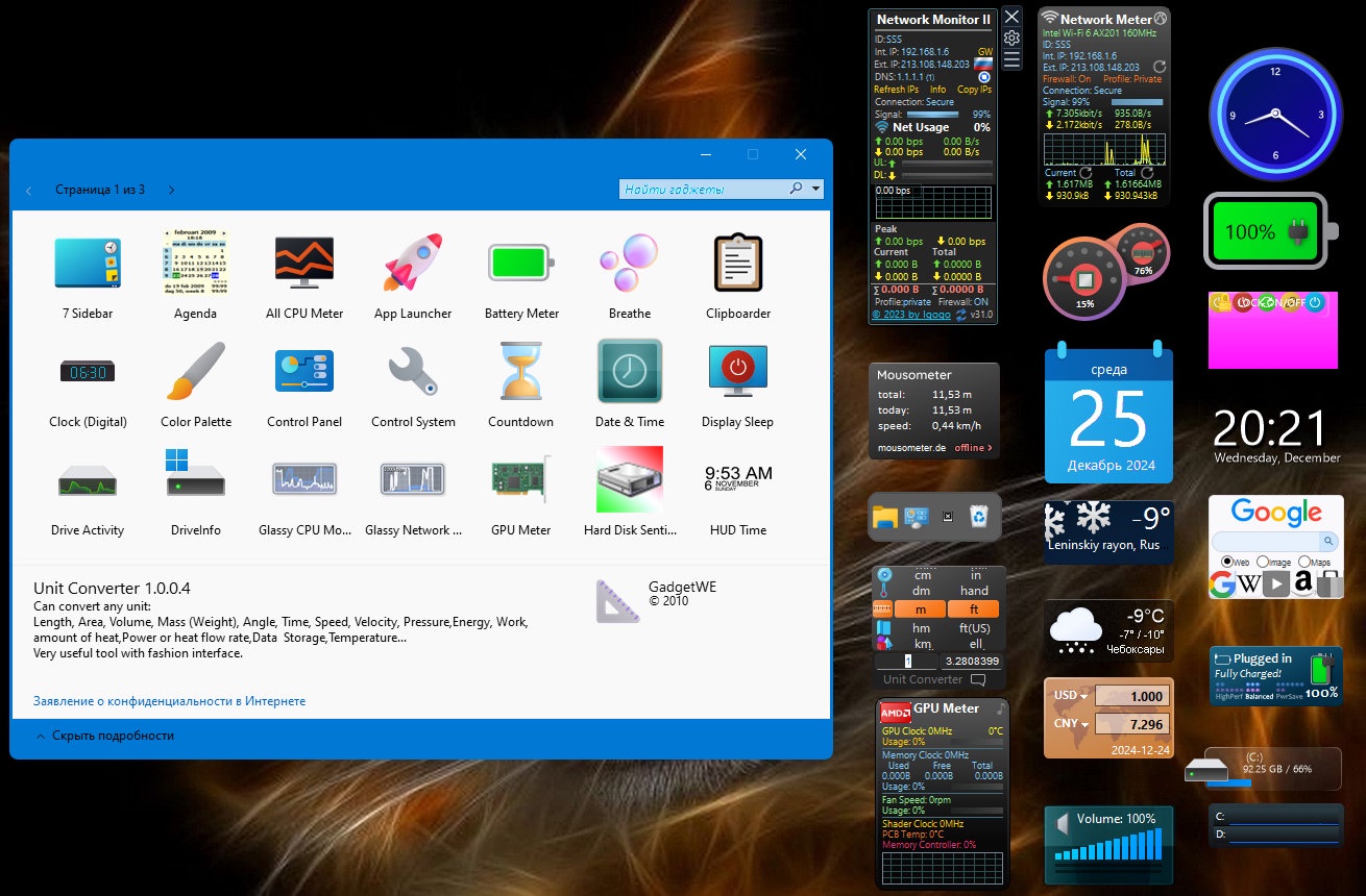 - Поддержка широкого набора гаджетов, включая часы, системные мониторы, погодные информеры и утилиты для контроля системы
