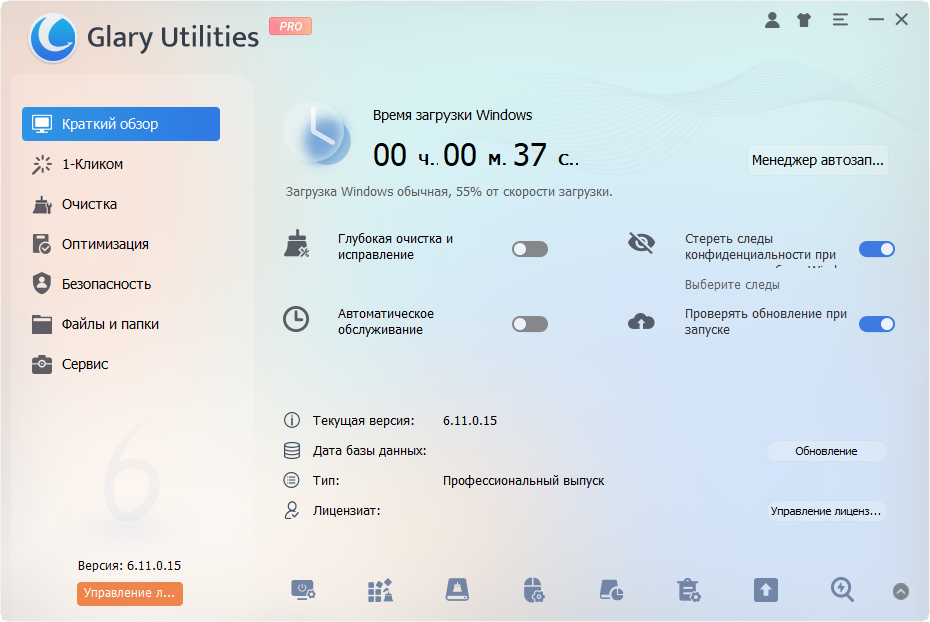 Glary Utilities Pro включает широкий спектр функций, обеспечивающих эффективное обслуживание системы и её безопасность. Благодаря интуитивно понятному интерфейсу и множеству утилит, программа позволяет легко управлять настройками и оптимизацией ПК.
