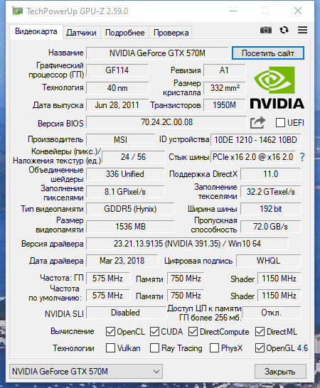 - Отображение полной технической информации о видеокарте, включая производителя, модель, тип видеопамяти и версию BIOS.