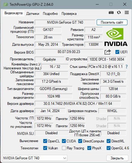 - Показ данных о драйверах, видеобиосе и поддерживаемых технологиях