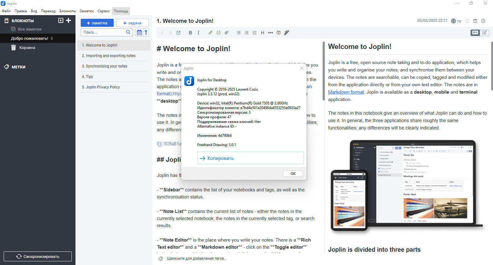 Ниже приведены основные технические характеристики версии Joplin 3.3.12: