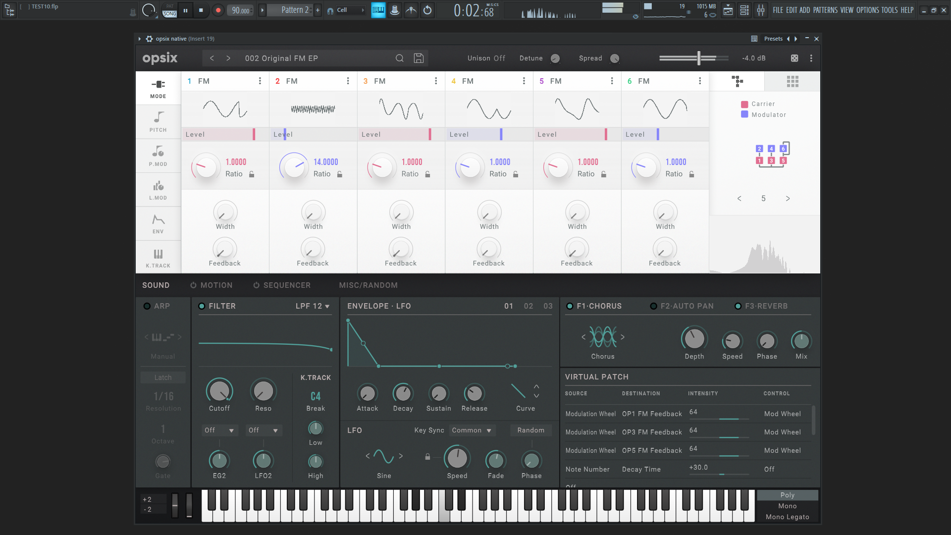 - Гибкая модуляция с шестью режимами оператора, тремя EG и тремя LFO для насыщенных эффектов.