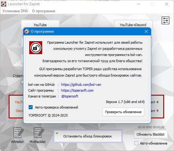 Launcher for Zapret — это удобное приложение, предназначенное для быстрого запуска утилиты Zapret, которая помогает обходить блокировки доступа к популярным сервисам и сайтам, таким как YouTube, Discord и другие. Программа значительно ускоряет настройку и работу с Zapret, делая процесс обхода блокировок более простым и эффективным.