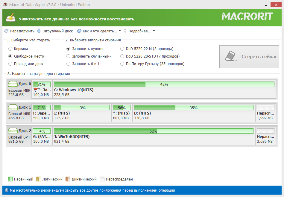 - Возможность полностью стирать диски и разделы без риска восстановления, что гарантирует безопасность данных.