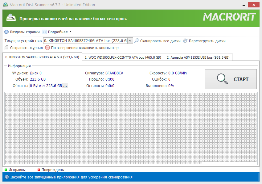 Macrorit Disk Scanner предназначен для быстрой и удобной диагностики жестких дисков, включая HDD, SSD, RAID и другие виды накопителей. Программа показывает состояние секторов, что позволяет принимать решения о необходимости замены или обслуживания диска.