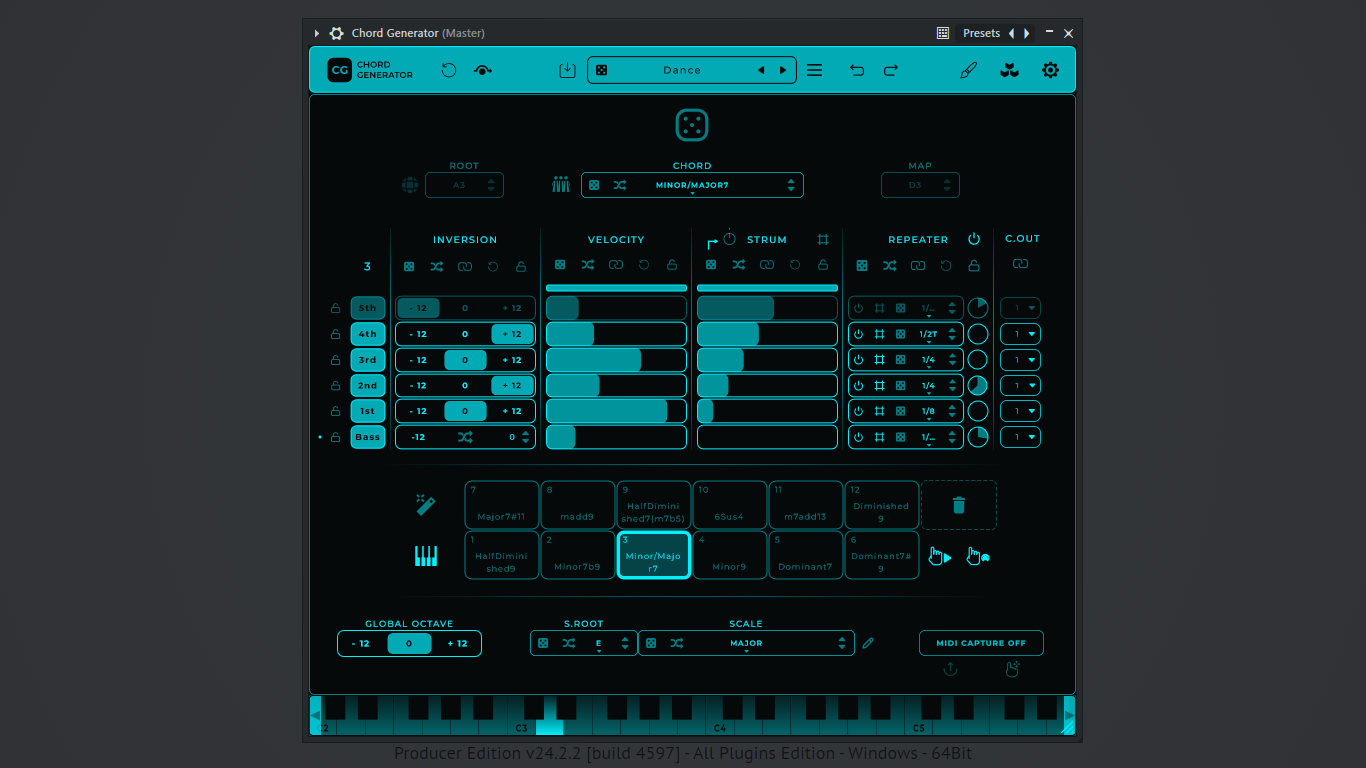 Chord Generator от Mario Nieto — это мощный MIDI-инструмент, предназначенный для создания гармоний и аккордовых вариаций с необычными и волшебными звучаниями. Он идеально подходит как для профессиональных музыкантов, так и для начинающих, желающих расширить свои возможности в музыкальном производстве.