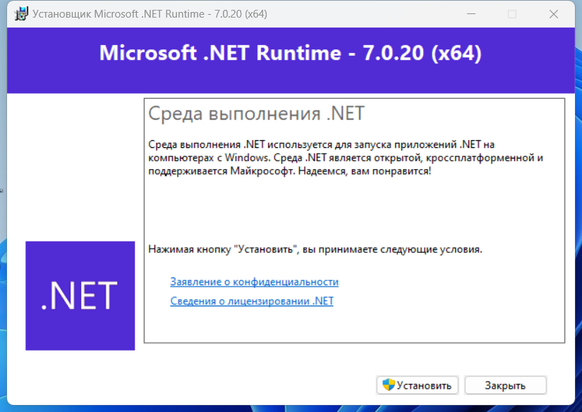 Ниже приведены основные технические характеристики Microsoft .NET 7.0.20 Runtime.