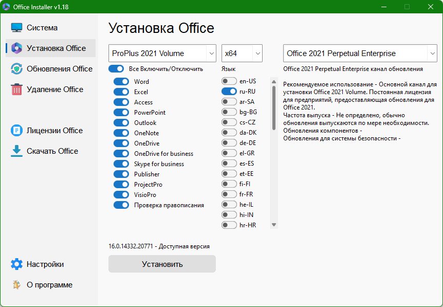 Office Installer & Office Installer+ 1.18 by Ratiborus — это программа, предназначенная для быстрой и удобной установки офисных пакетов Microsoft Office как в онлайн, так и в офлайн режиме. Она позволяет создавать собственные дистрибутивы и управлять активацией продукта, что особенно полезно для системных администраторов и опытных пользователей.