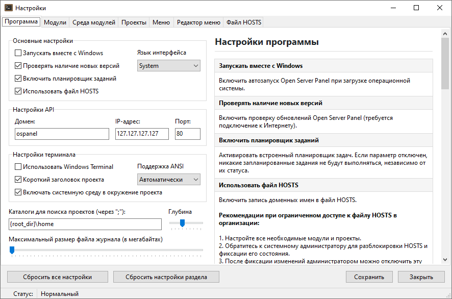 Open Server Panel 6.2.9 предоставляет пользователю удобный интерфейс и расширенные функции для настройки и управления локальной веб-средой. Программа позволяет быстро запускать и останавливать необходимые компоненты, управлять проектами и следить за их состоянием, что значительно ускоряет процесс разработки.
