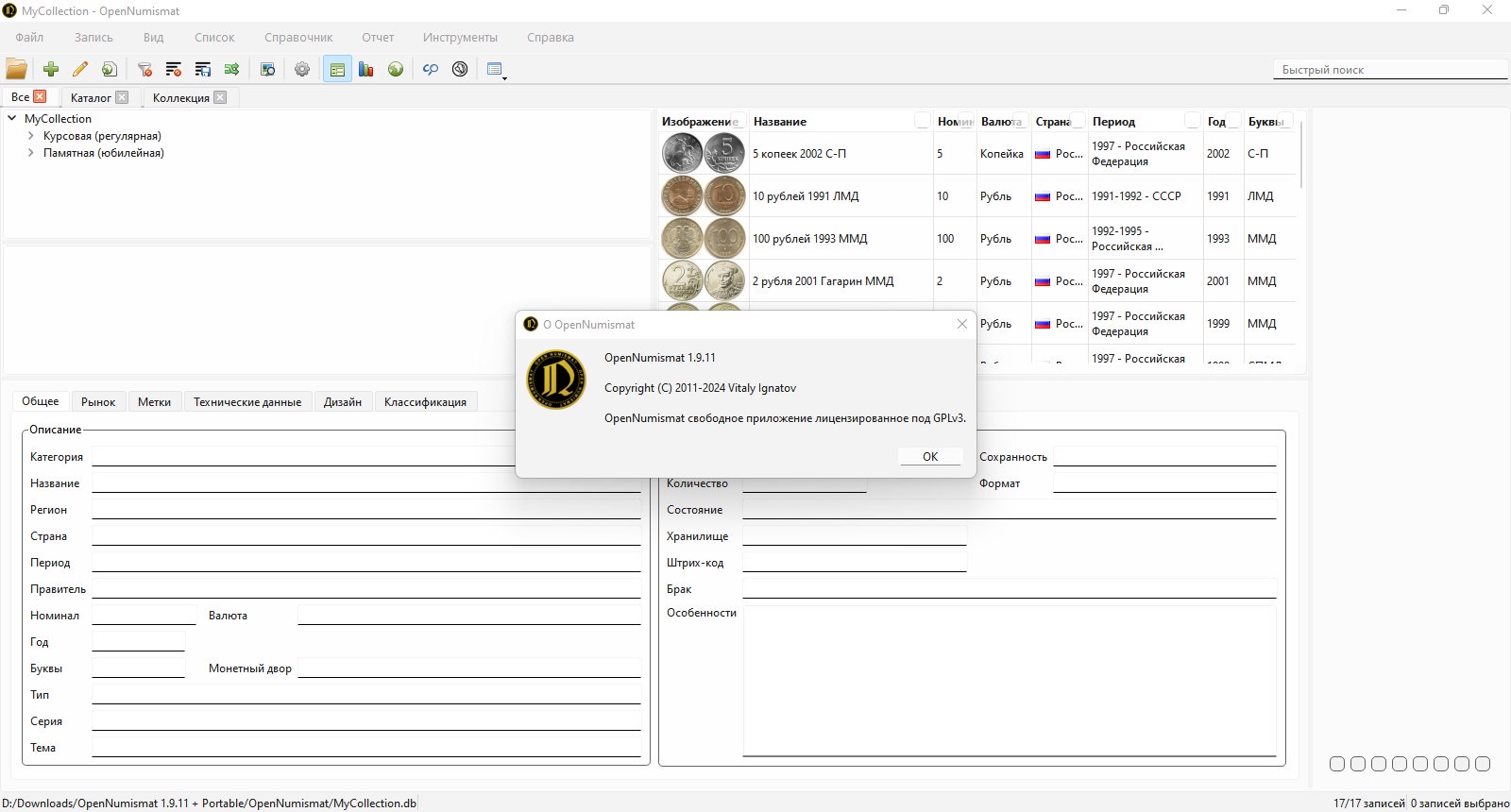 OpenNumismat 1.9.11 — это мощное программное обеспечение, предназначенное для коллекционеров монет и нумизматов, позволяющее удобно управлять и систематизировать коллекции. Программа обеспечивает полный контроль над каталогом, предоставляет инструменты для анализа и оформления коллекции в различных форматах.