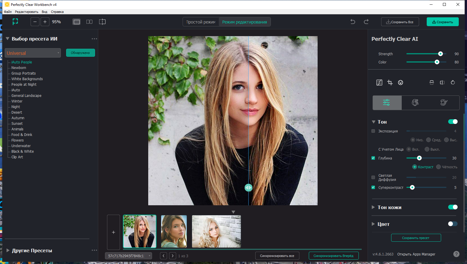 Perfectly Clear WorkBench предлагает широкий набор инструментов для автоматической и ручной обработки изображений, позволяя добиваться высококачественных результатов без сложных настроек. Благодаря интеллектуальным алгоритмам программа исправляет дефекты фотографий и подчеркивает их лучшие стороны.