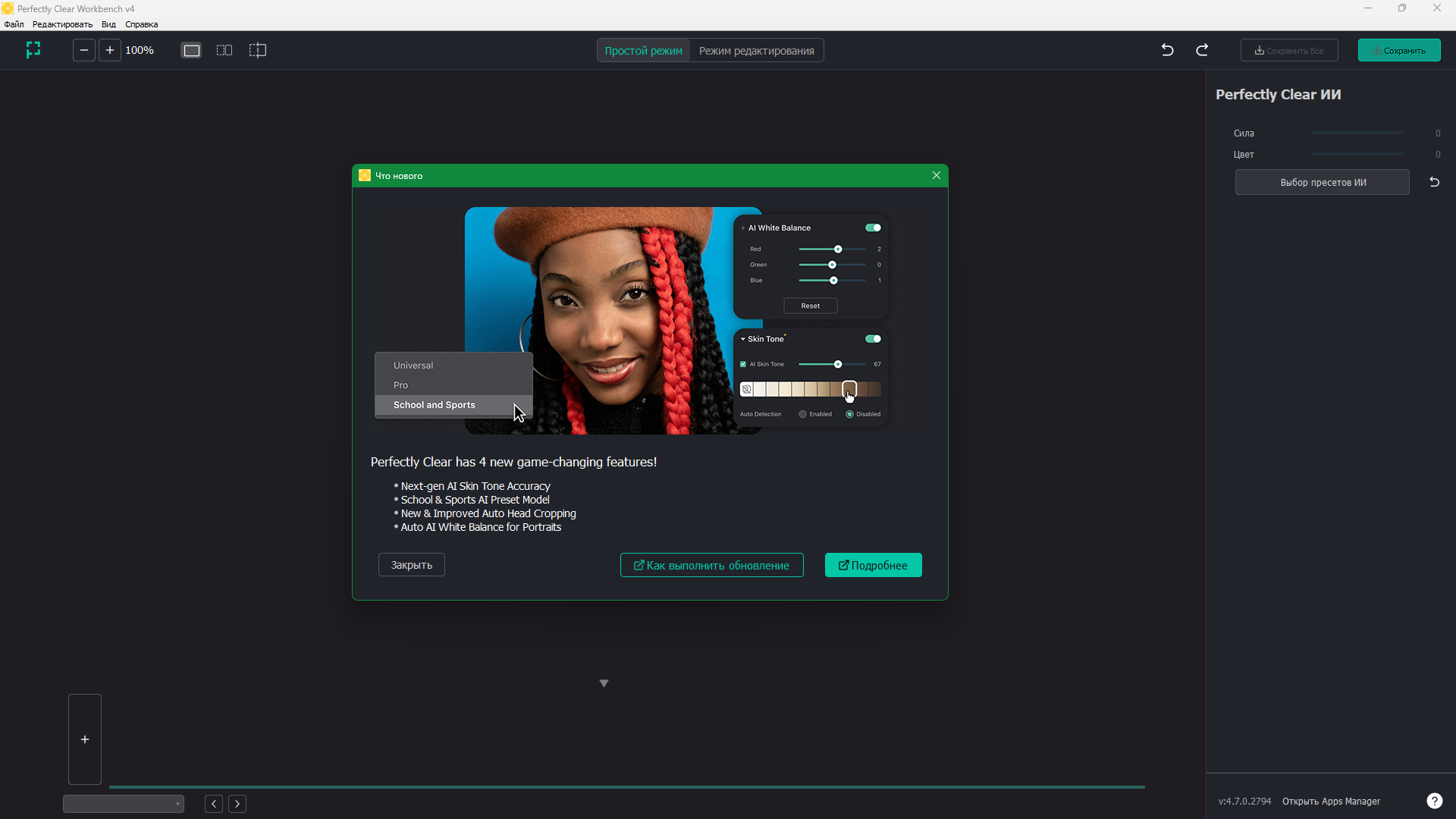 Perfectly Clear WorkBench — это мощное приложение для автоматической и ручной коррекции фотографий, которое помогает добиться профессионального качества изображений всего за несколько кликов. Программа идеально подходит как для любителей, так и для профессиональных фотографов, желающих быстро улучшить свои снимки.