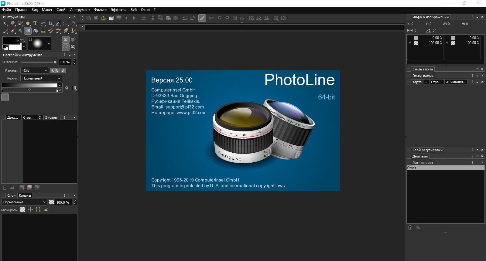 PhotoLine 25.00 — это мощный редактор растровой и векторной графики, предназначенный для профессиональных и любительских задач. Программа обладает широкими возможностями по обработке изображений, созданию графики и автоматизации работы с файлами, что делает её универсальным инструментом для дизайнеров, фотографов и веб-мастеров.