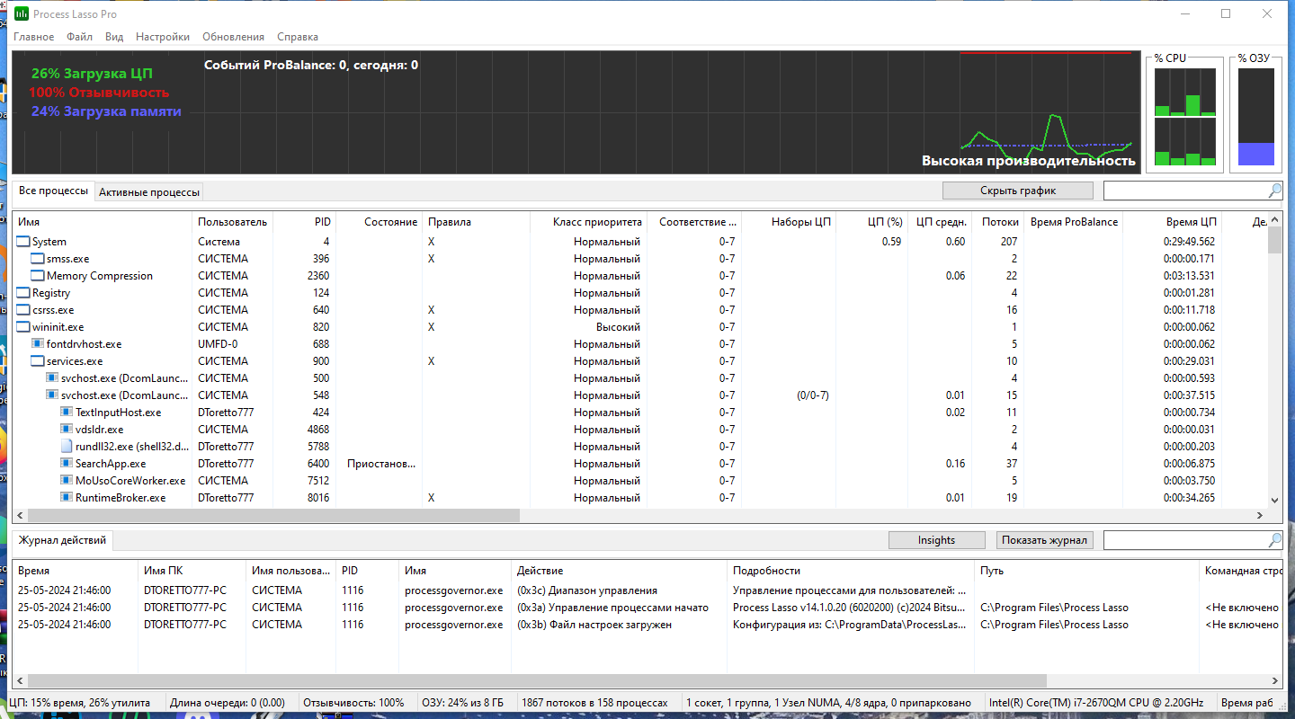 Process Lasso Pro предоставляет пользователю инструменты для тонкой настройки работы системы, улучшая отклик и предотвращая зависания из-за чрезмерной загрузки процессора. Благодаря этому решению, даже при запуске тяжелых приложений или множественных задач, система остается отзывчивой и стабильной.