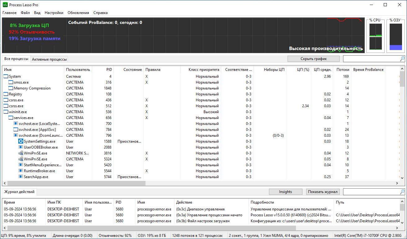Process Lasso Pro предоставляет пользователю инструменты для контроля и автоматической регулировки процессов, что особенно важно для тех, кто ценит максимальную производительность и стабильность системы во время интенсивных нагрузок или в режиме многозадачности.