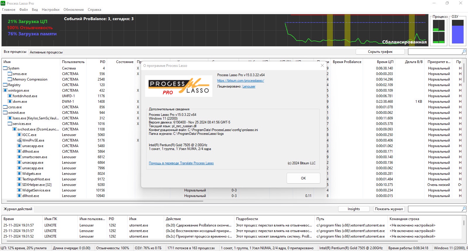 Process Lasso предоставляет пользователю инструменты для автоматического и ручного регулирования процессов, что значительно повышает быстродействие и стабильность системы. В основе работы лежит технология ProBalance, которая перераспределяет приоритеты процессов для предотвращения зависаний и снижения нагрузки на процессор.