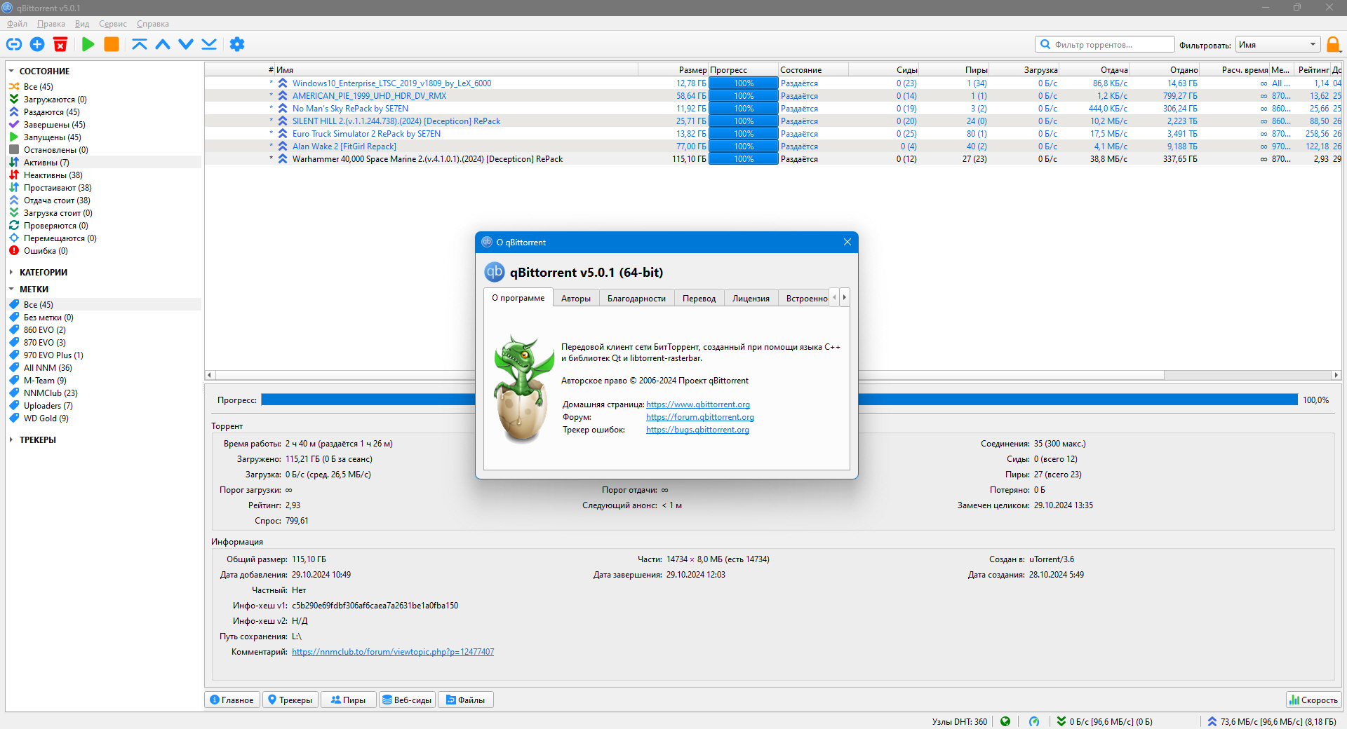 Ниже приведены технические характеристики текущей версии qBittorrent 5.0.1: