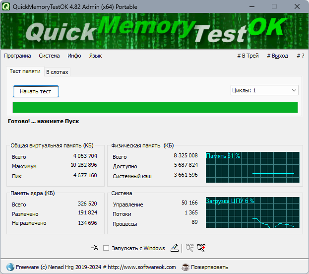 QuickMemoryTestOK — это небольшая, но очень эффективная утилита, предназначенная для быстрой диагностики ошибок оперативной памяти. Благодаря простому интерфейсу и минимальному потреблению ресурсов, программа идеально подходит как для профессиональных тестов, так и для домашнего использования.