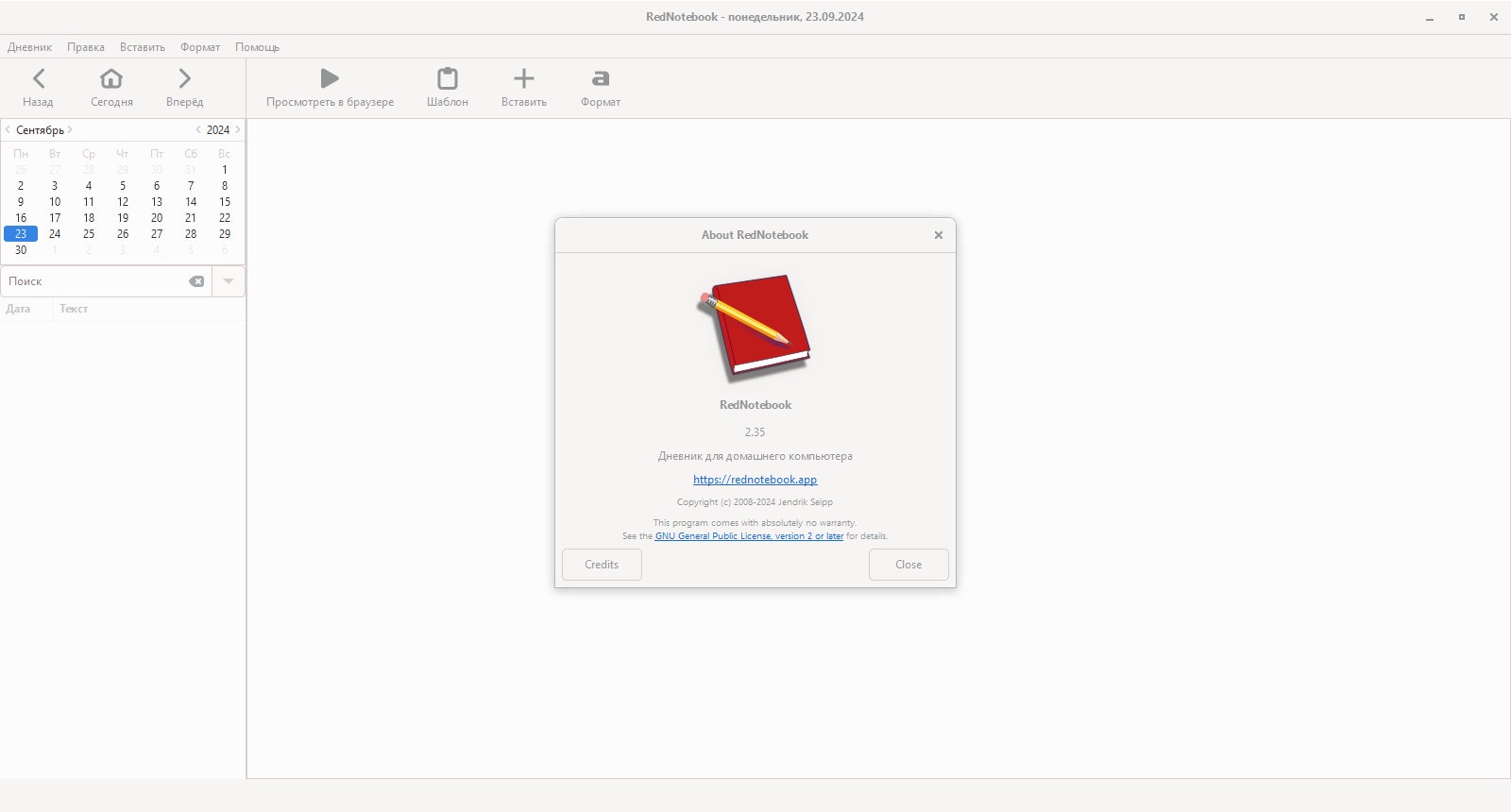 RedNotebook — это удобное и простое приложение для ведения электронных дневников и записных книжек. Оно предназначено для организации личных заметок, событий и мыслей, предлагая пользователю широкий набор функций для удобного хранения и быстрого поиска информации.