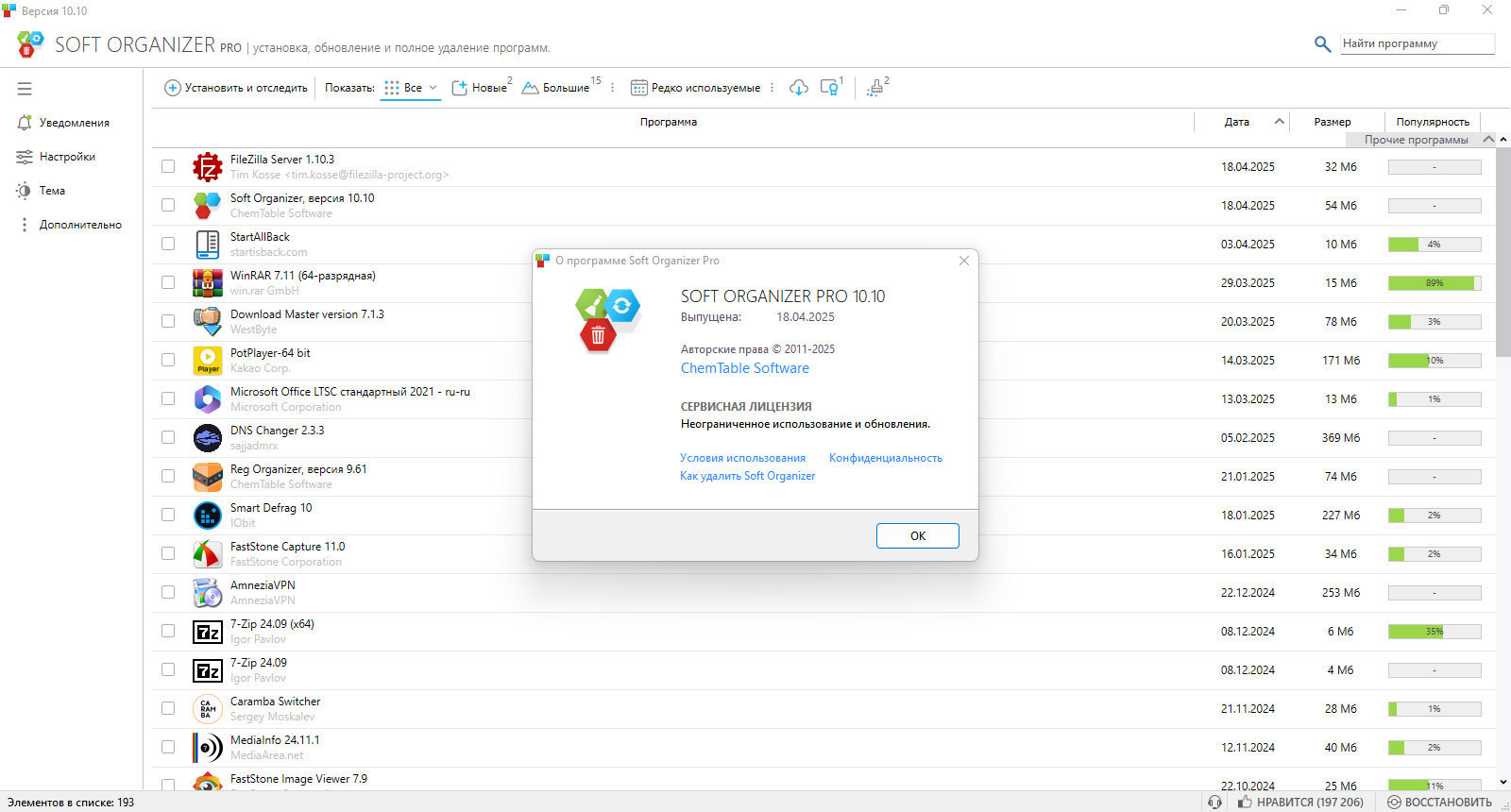 Ниже приведены основные технические данные о версии Soft Organizer Pro 10.10: