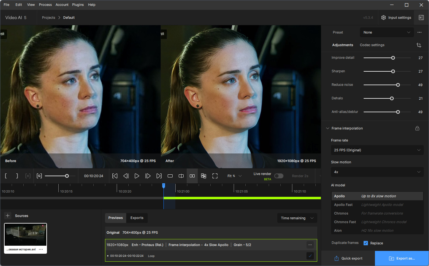 - Увеличение разрешения видео до 8K с сохранением деталей