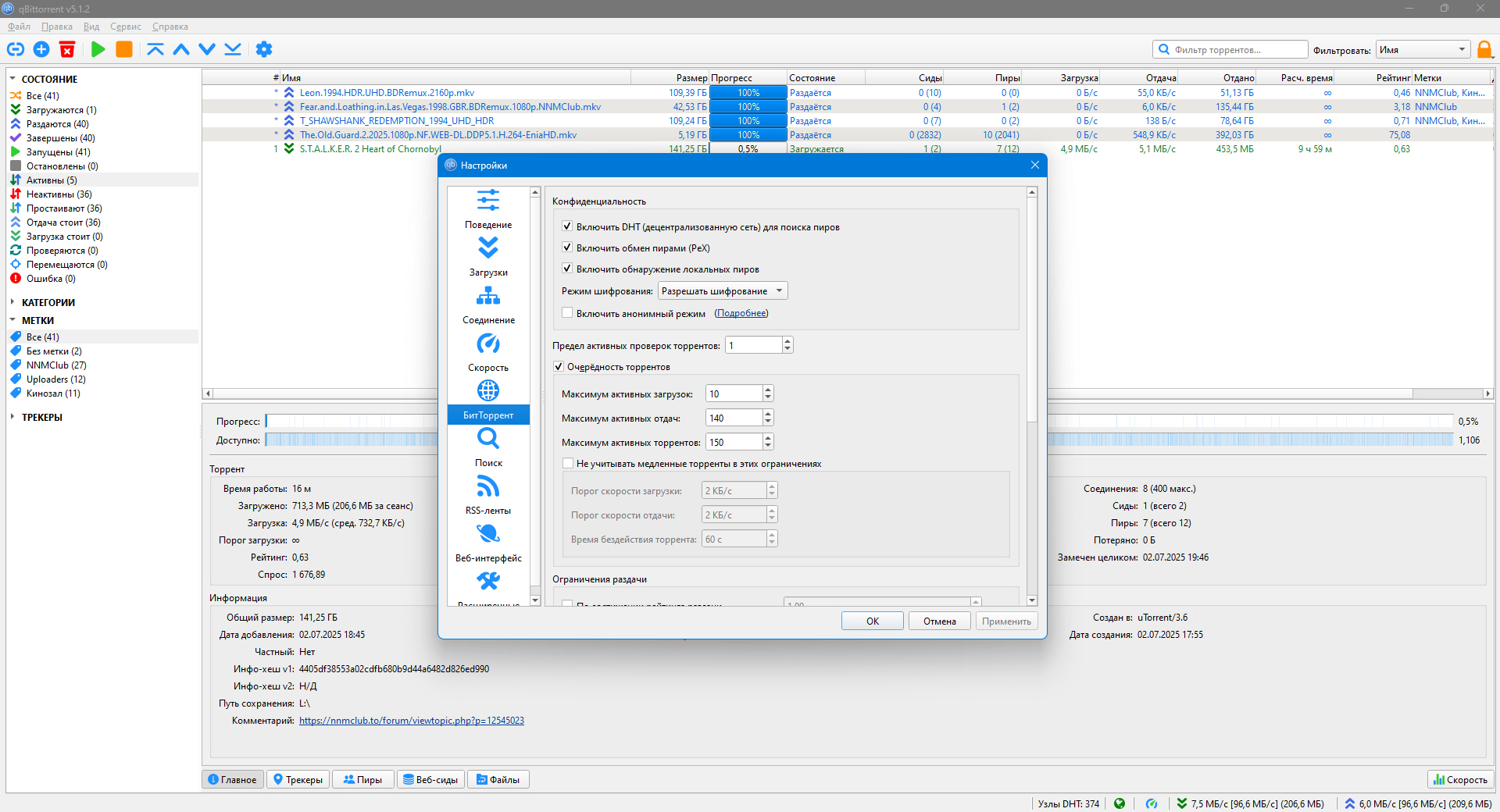 - Редактировать информацию о торренте, такую как название, комментарий, URL и трекеры.