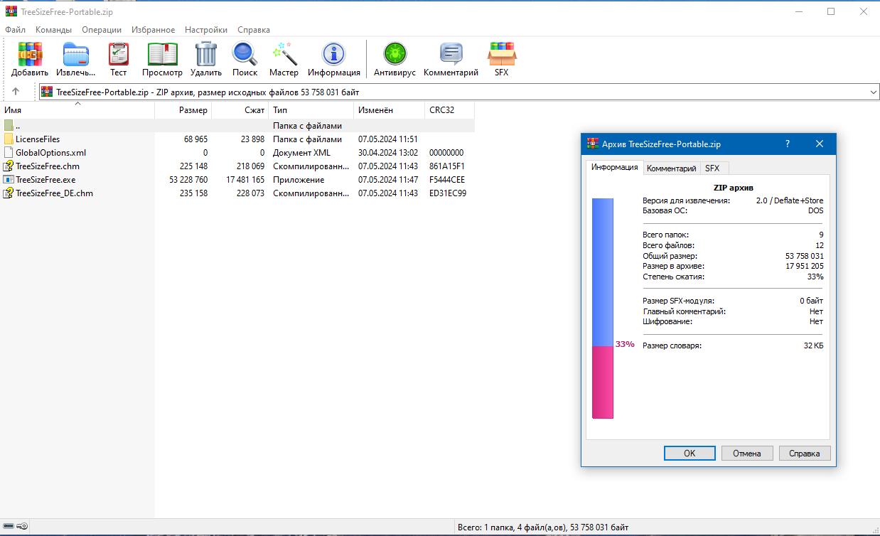 Ниже представлена таблица с основными характеристиками TreeSize Free: