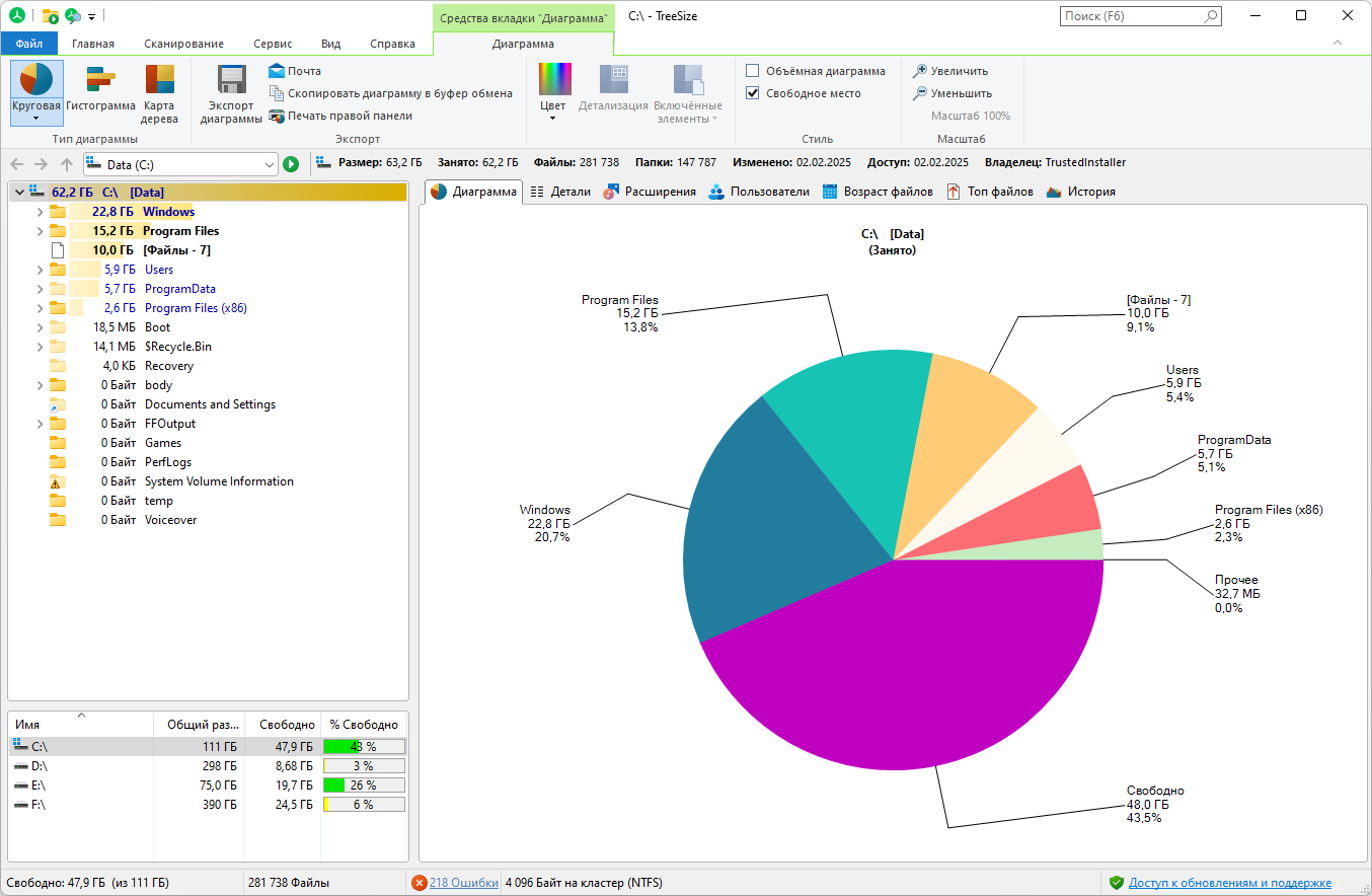 TreeSize Professional — это мощная программа для анализа и управления дисковым пространством на компьютере. Она помогает пользователям быстро выявлять крупные, устаревшие или ненужные файлы, освобождая место на жестком диске и повышая эффективность работы системы.