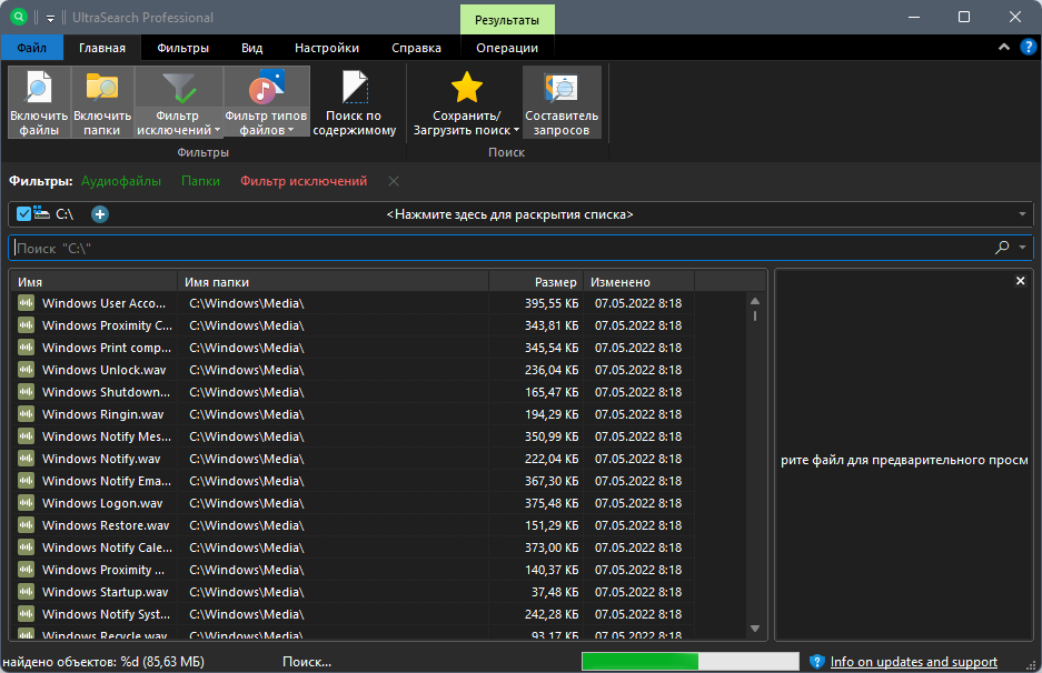 UltraSearch Professional позволяет находить файлы и папки за считанные секунды, работая напрямую с таблицей MFT разделов NTFS. Это обеспечивает минимальную задержку и высокую эффективность поиска даже при большом объеме данных.