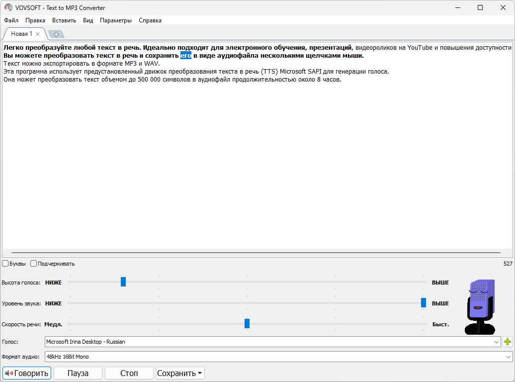 Vovsoft Text to MP3 Converter — это простая и эффективная программа для преобразования текста в аудиофайлы. Она предназначена для создания озвучки, повышения доступности контента и подготовки голосовых дорожек для видео и презентаций.