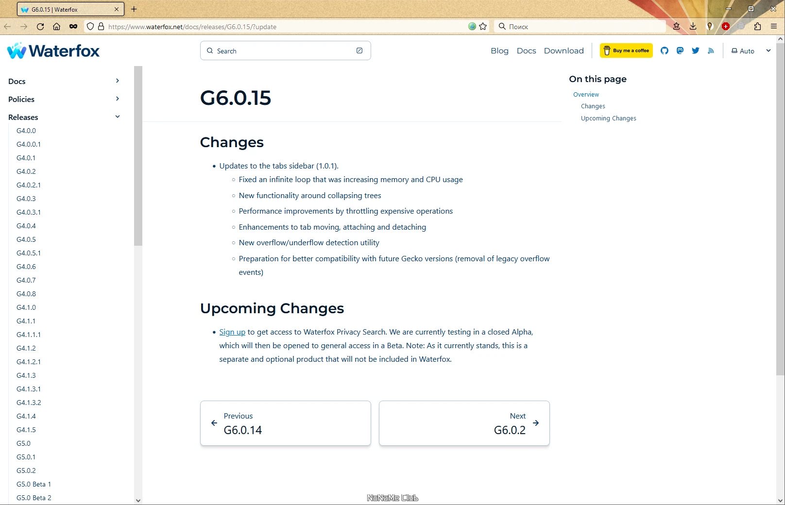 Ниже представлена таблица с актуальными данными о версии, языке интерфейса и особенностях сборки Waterfox Current G6.0.15:
