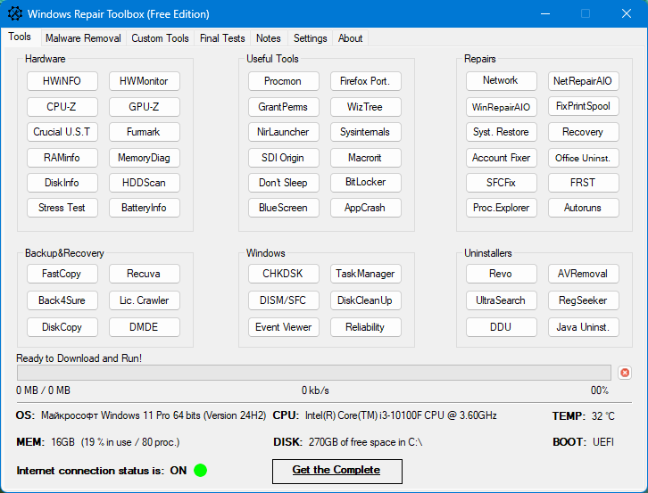 Windows Repair Toolbox представляет собой графическую оболочку для набора бесплатных инструментов, предназначенных для быстрого решения проблем Windows. Программа упрощает управление системными утилитами, автоматизирует их обновление и позволяет быстро приступить к выполнению задач по ремонту и оптимизации системы.
